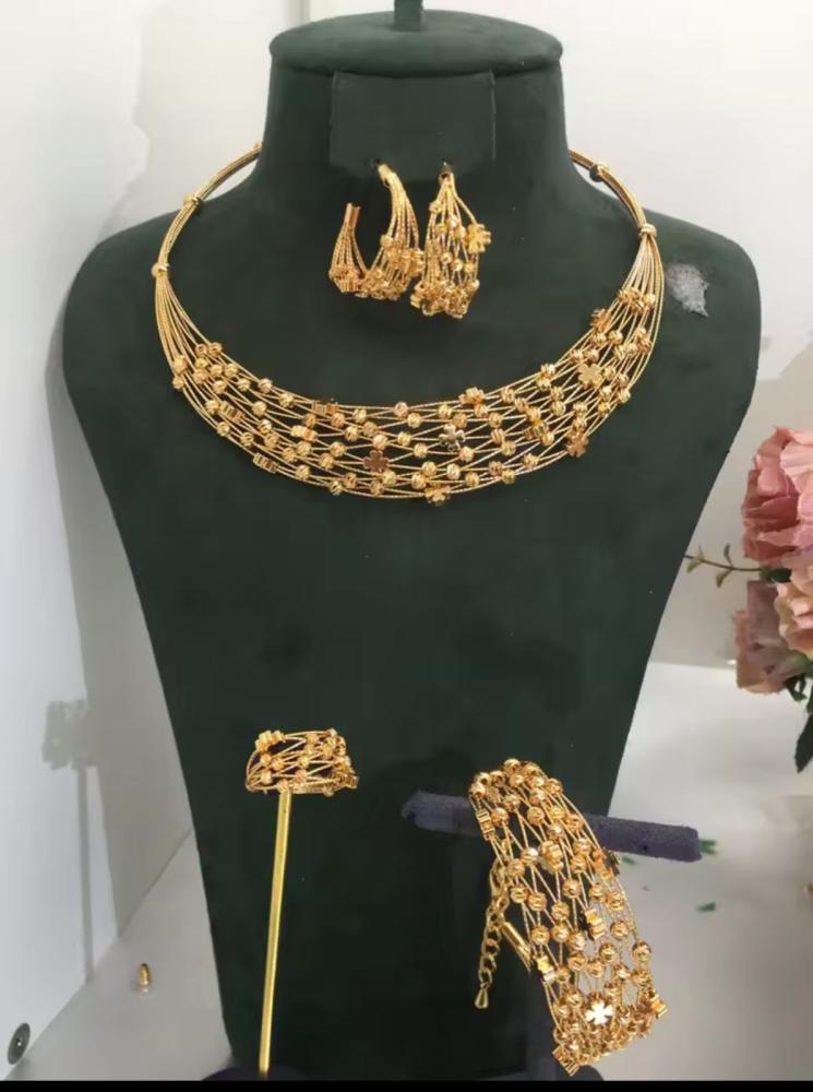 يتكون الطقم من عقد عريض، وأقراط متدلية، وسوار أنيق، وخاتم بتصميم متناسق مع باقي المجموعة.